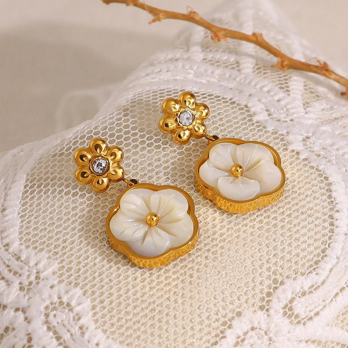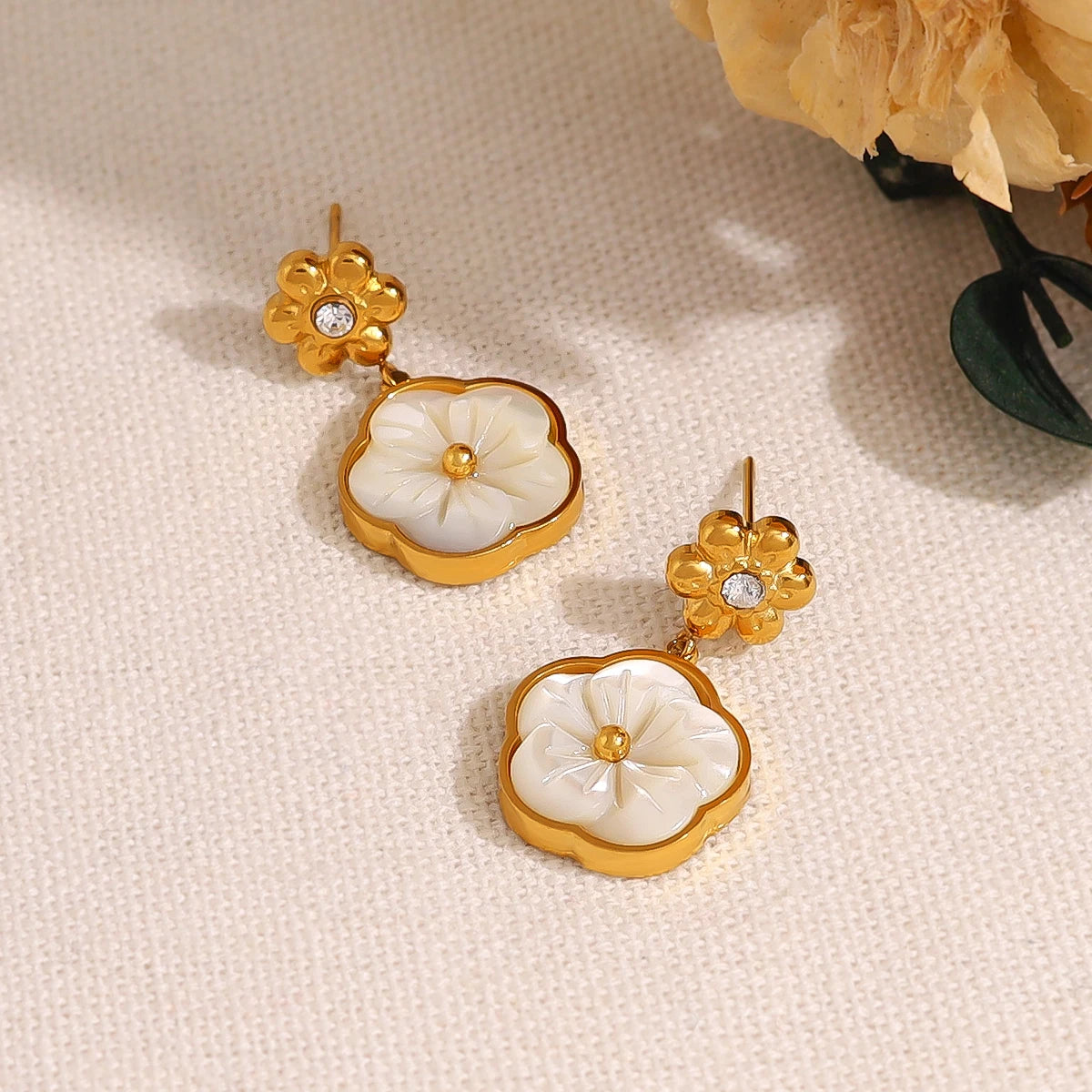 Waterproof Pearl Shell Pansy Flower Earrings 18K Gold Plated